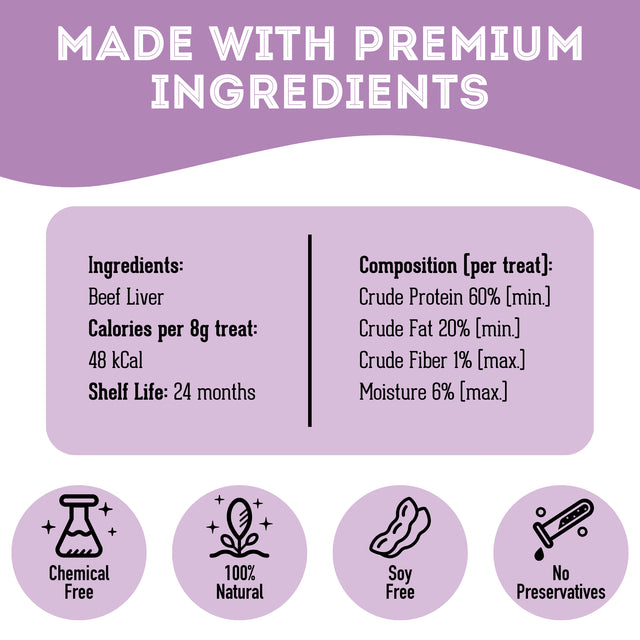 These treats are made with high-quality, real ingredients, including nutrient-rich pork liver and delicious cheese. They also contain essential nutrients, vitamins, and minerals that support overall health.