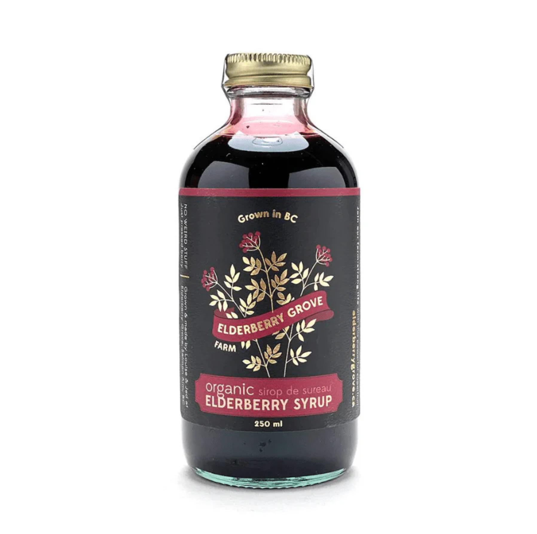 Elderberry Syrup is Elderberry Grove's most popular offering; loaded with organic elderberries fresh from their farm, sweetened with organic BC honey plus a little bit of organic lemon juice. This elderberry syrup is a family staple loved by kids of all ages!